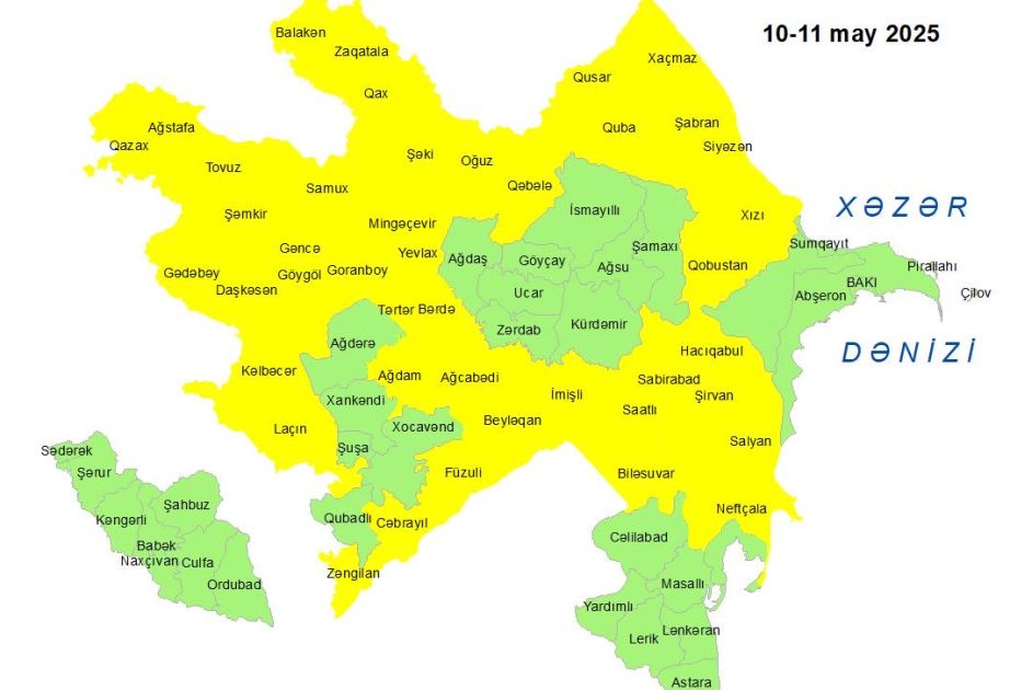 Milli Hidrometeorologiya Xidməti mayın 10-11-də bəzi bölgələrdə gözlənilən küləkli hava şəraiti ilə bağlı sarı xəbərdarlıq verib.