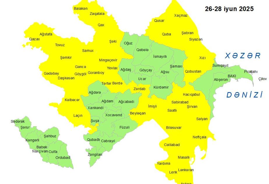 Milli Hidrometeorologiya Xidməti iyunun 26-28-də bəzi bölgələrdə gözlənilən küləkli hava şəraiti ilə bağlı sarı xəbərdarlıq verib.