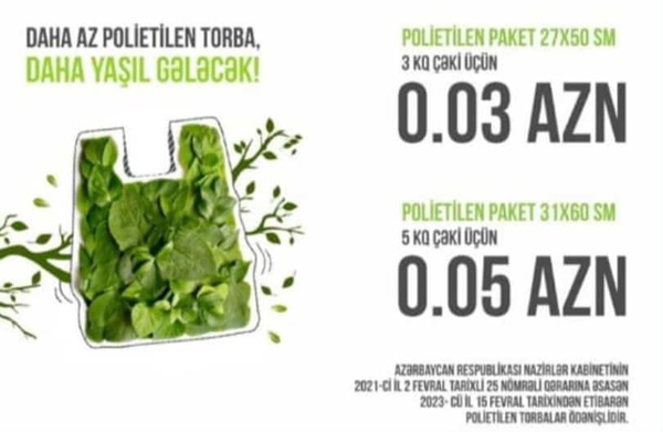 Ekoloji problemlərin həllinə yönəldilmiş tədbirlərin səmərəliliyini artırmaq məqsədilə  Azərbaycanda bu il fevralın 15-dən etibarən, qalınlığı 15-20 mikron olan yüngülçəkili polietilen torbalar müştərilərə ödənişli qaydada və nəzarət-kassa aparatlarında ayrıca məhsul növü kimi təqdim edilir.