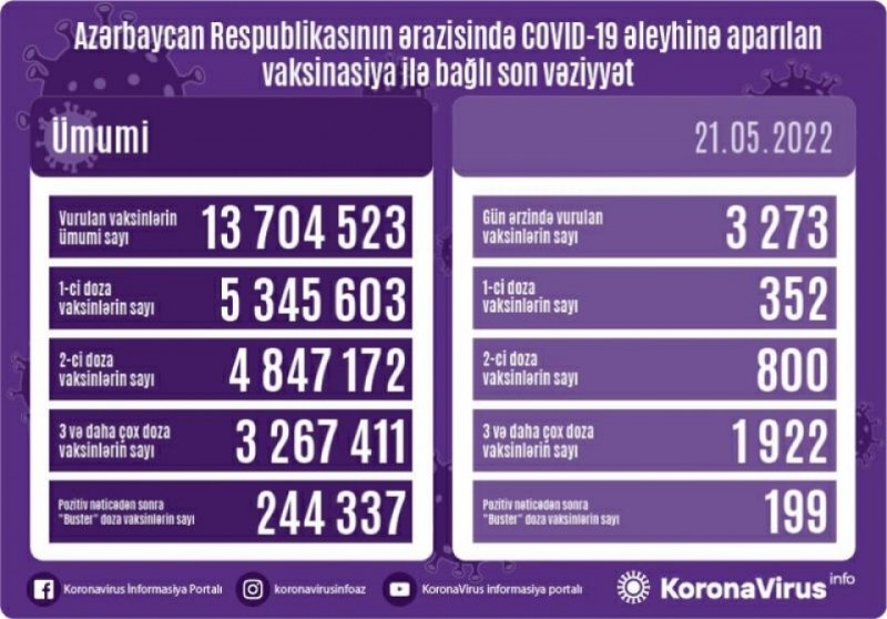 Mayın 21-də Azərbaycanda yeni növ koronavirus (COVID-19) infeksiyası əleyhinə 3 min 273 doza vaksin vurulub.