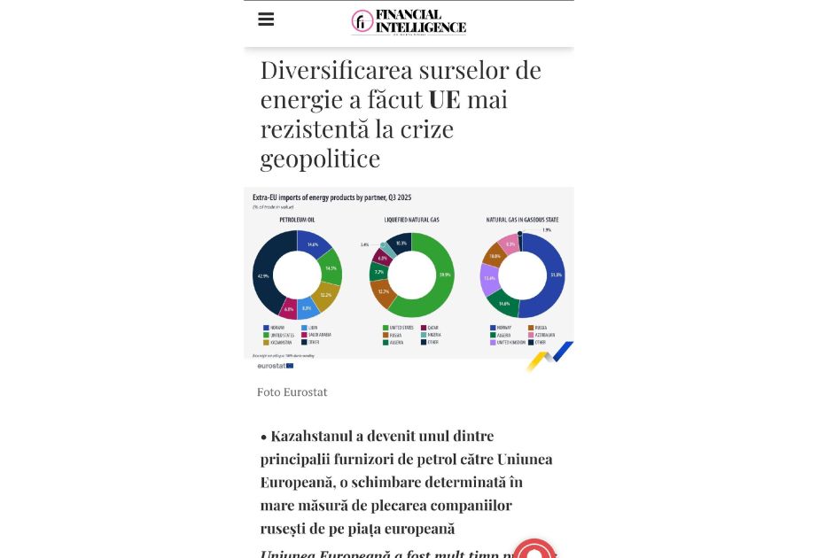 Rumıniyanın ixtisaslaşmış iqtisadi nəşri “Financial Intelligence” Avropa İttifaqının enerji siyasətinə dair analitik materialında bildirib ki, son illərdə enerji mənbələrinin şaxələndirilməsi istiqamətində atılan addımlar Aİ-ni geosiyasi böhranlara qarşı daha dayanıqlı edib.