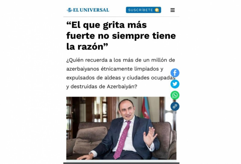 Meksikanın ən nüfuzlu mətbu orqanlarından olan “El Universal” qəzetində Azərbaycanın bu ölkədəki səfiri Məmməd Talıbovun “Uca danışan hər zaman haqlı deyil” başlıqlı məqaləsi dərc edilib.