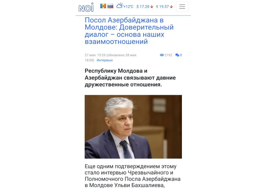 AZƏRTAC xəbər verir ki, bu fikirləri 28 May - Müstəqillik Günü ilə əlaqədar Moldovanın “noi.md” saytına müsahibəsində Azərbaycanın bu ölkədəki səfiri Ülvi Baxşəliyev söyləyib.