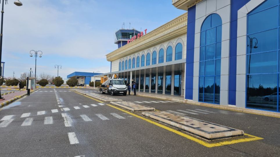 AZƏRTAC-ın bölgə müxbiri xəbər verir ki, hazırda aeroportun dron zərbəsindən zərər görmüş hissələrində təmir işləri aparılır.