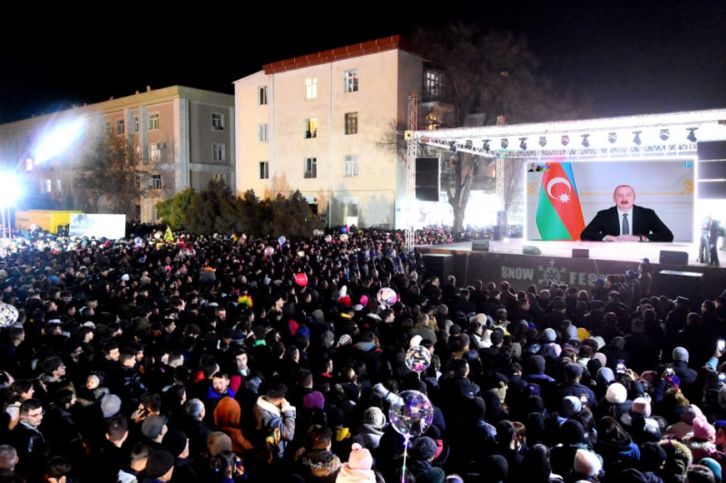 Prezident İlham Əliyevin 31 Dekabr - Dünya Azərbaycanlılarının Həmrəyliyi Günü və Yeni il münasibətilə Azərbaycan xalqına müraciəti meydanda quraşdırılan monitor vasitəsilə yayımlanıb.