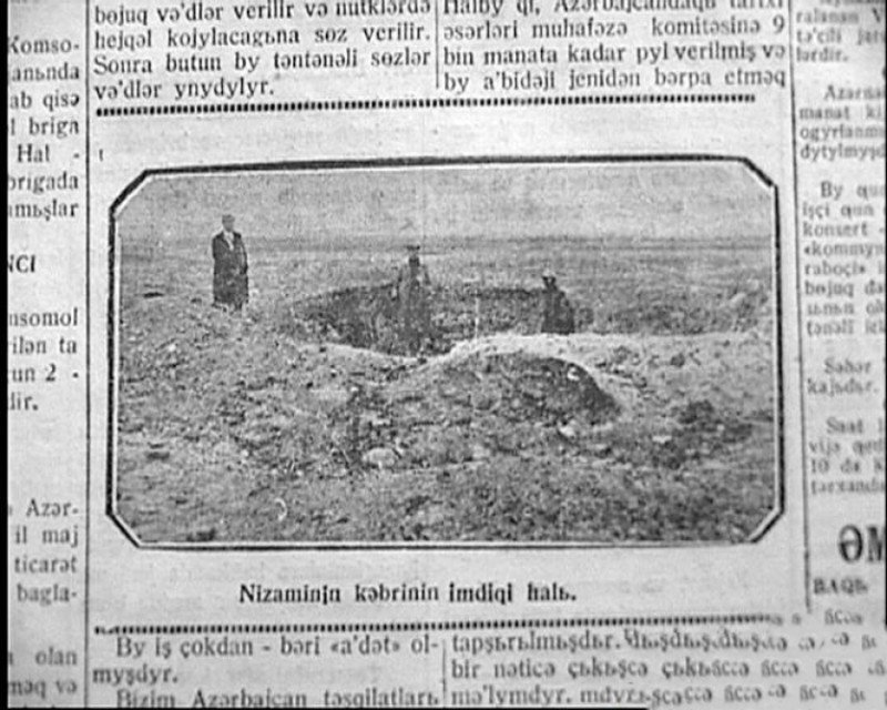 Nizami irsi və həyatı ilə yaxından maraqlanan Bəxtiyar Məhərrəmov araşdırmaçıların ilkin mərhələdə əldə etdikləri tapıntılarla qane olmadığını deyir: “Məqbərənin içinə tökülmüş daş və torpaq təmizləndikdən sonra bir qəbir aşkar olunub. Qəbirdən çıxarılan sümüklərin Nizamiyə aid olduğu düşünülərək, onlar taxta yeşiyə yığılıb. Lakin sümüklərin çox incə və kiçik olması komissiya üzvlərini şübhələndirir və onlar məqbərə səthini təzədən qazmağa başlayırlar. Təxminən 1 metr dərinliyə doğru qazıntı apardıqdan sonra taxta tabuta rast gəlinir. Məlum olur ki, Nizaminin cənazəsi kəfənə büküldükdən sonra üstündən tirmə ilə sarınıb və palıddan hazırlanmış bir tabuta qoyulub. Tabutun özünün də tirmə ilə sarınması cənazənin böyük ehtiram və hörmətlə dəfn edildiyindən göstərir”.