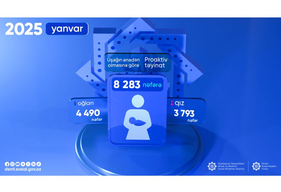 Bu ilin yanvar ayı ərzində 8283 uşağın anadan olmasına görə proaktiv qaydada birdəfəlik müavinət təyin olunaraq Dövlət Sosial Müdafiə Fondu tərəfindən ödəniş edilib.
