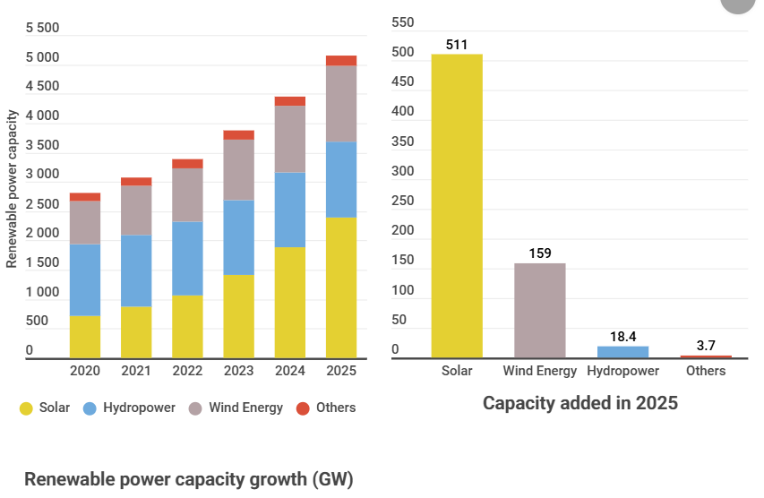 Hesabata görə, ötən il bərpaolunan enerji gücündəki artımda Günəş enerjisi əsas rol oynayıb. Belə ki, Günəş enerjisi 511 giqavat artaraq ümumi artımın 73,8 faizini təşkil edib. Külək enerjisi isə 159 giqavatlıq artımla ikinci yerdə qərarlaşıb. Nəticədə, bu iki mənbə ümumi artımın 96,8 faizini təşkil edib.