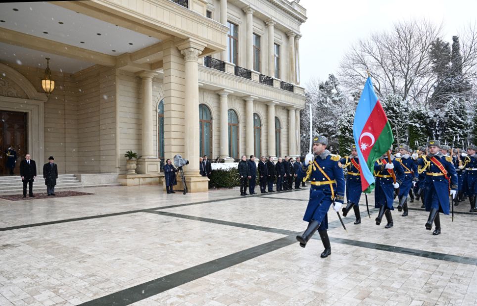 Fəxri qarovul dəstəsi hərbi marşın sədaları altında Prezident İlham Əliyevin və Baş nazir Məhəmməd Şahbaz Şərifin qarşısından keçdi.