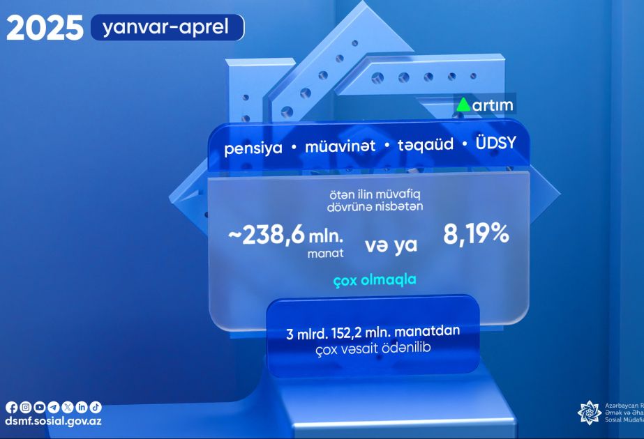 Bu ilin yanvar-aprel ayları ərzində pensiya, müavinət, təqaüd və ünvanlı dövlət sosial yardımları üzrə 3 milyard 152,2 milyon manatdan çox vəsait ödənilib.
