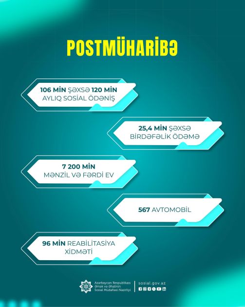 Əmək və Əhalinin Sosial Müdafiəsi Nazirliyin İctimaiyyətlə əlaqələr şöbəsindən AZƏRTAC-a verilən məlumata görə, həmin sosial dəstək paketi üzrə postmüharibə dövründə şəhid ailələri üzvləri və müharibə veteranları olan 106 min şəxsə sosial ödəniş təyinatı üzrə 120 min xidmət göstərilib, 25,4 min şəxsə birdəfəlik ödəmə təyin olunub.