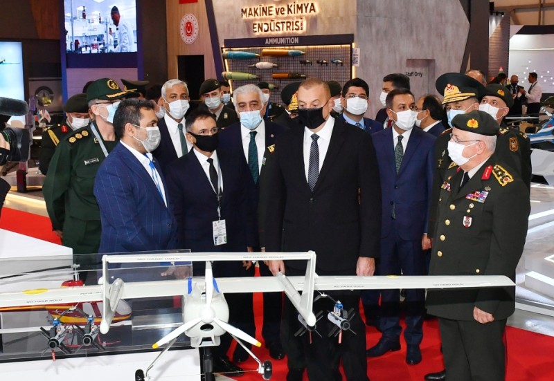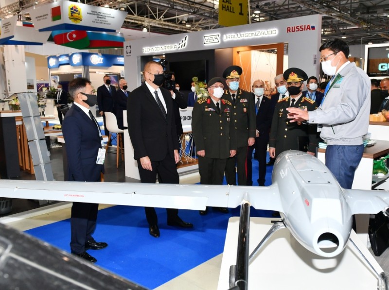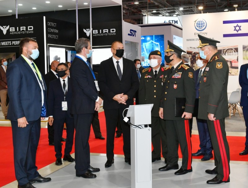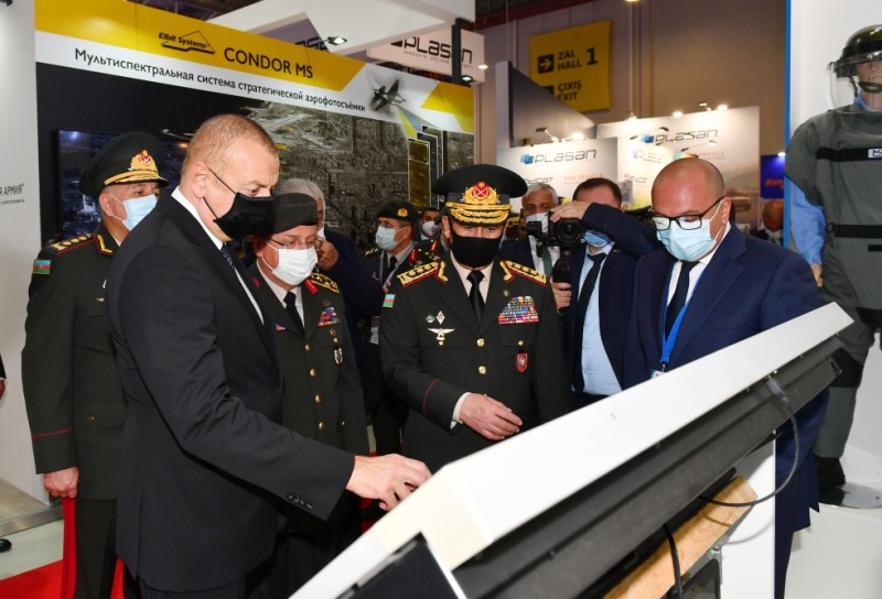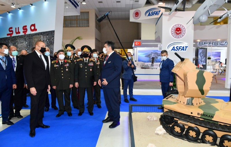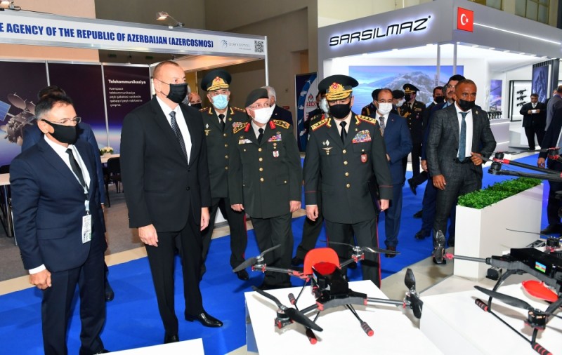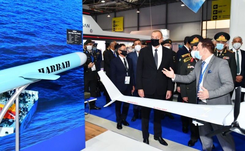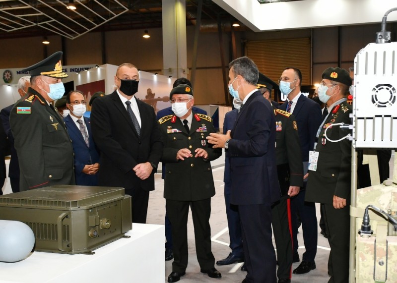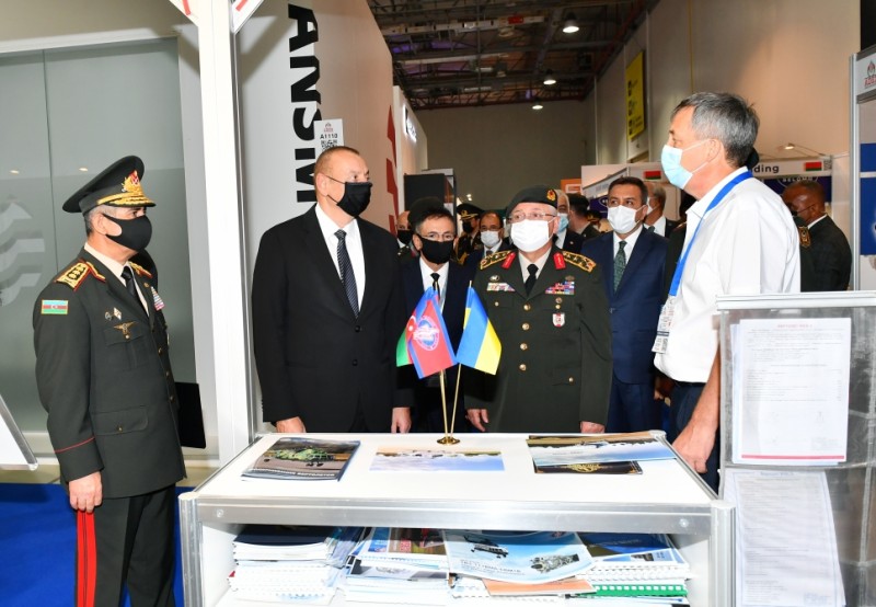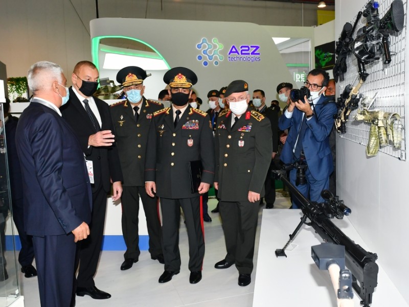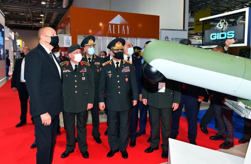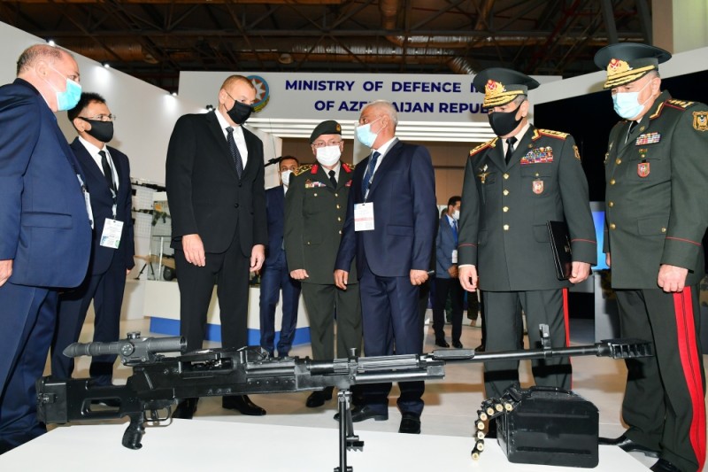 Prezident İlham Əliyev Azərbaycan Müdafiə Sənayesi Nazirliyinin pavilyonunda nümayiş etdirilən hərbi məmulatlara baxdı. Milli Təhlükəsizlik Qüvvələrinin ehtiyaclarını ödəmək üçün müdafiə təyinatlı məmulatların, döyüş sursatlarının, zirehli hərbi texnikanın və digər vasitələrin yaradılması, istehsalı, təkmilləşdirilməsi, təmiri, utilizasiyası, idxalı/ixracına və xarici bazarlarda satışına cavabdeh olan nazirliyin pavilyonlarında son illərdə ölkəmizdə istehsal olunan yüngül və ağır hərbi texnikalar nümayişə çıxarılıb. Döyüş kəşfiyyat texnikası, çoxməqsədli, kəşfiyyat və zərbə pilotsuz uçuş aparatları, müxtəlif çaplı atıcı silahlar, mühəndislik texnikaları və digər hərbi texnikalar sərginin maraq doğuran eksponatları sırasındadır.