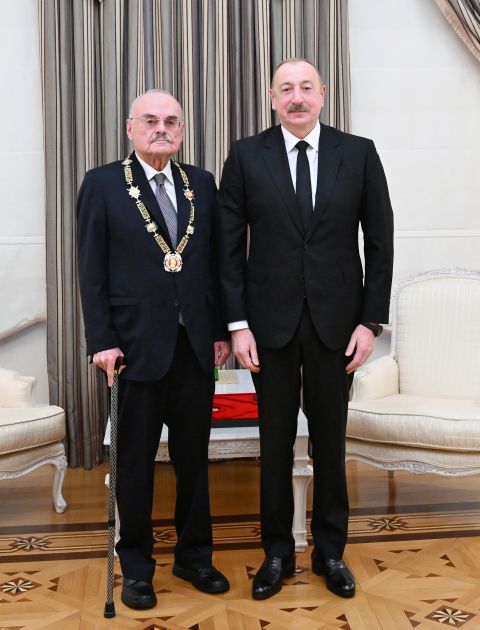 Biz sizinlə 15 il işləmişik - 2003-cü ildən 2018-ci ilə qədər. Hesab edirəm ki, o illər Azərbaycan iqtisadiyyatı üçün ən sürətli inkişaf illəri olmuşdur. Azərbaycan iqtisadiyyatı o illərdə bəlkə də iki dəfə çox artmışdır və ölkə qarşısında duran əsas infrastruktur layihələrinin həlli, ya da ki, başlanması məhz o illərə təsadüf edir. Sizin rəhbərliyinizlə Nazirlər Kabineti Prezidentin tapşırıqlarını ləyaqətlə yerinə yetirirdi və bu gün Azərbaycanın dayanıqlı iqtisadi inkişafı təbii olaraq bizim müstəqilliyimizin əsasını təşkil edir. Birlikdə işlədiyimiz 15 il ərzində daim təmasda idik, məsələləri müzakirə edirdik, həll edirdik. 2018-ci ildən sonra da təmasdayıq. Şadam ki, siz yubileyinizi çox yaxşı fiziki formada qarşılayırsınız və sizi həmişə görmək mənim üçün xoşdur. İllər boyunca bir çox telefon söhbətimiz olubdur, bir çox məsələləri müzakirə etmişik. Sizi bu gün gözəl yubiley ərəfəsində dəvət etdim ki, sizə Azərbaycan dövlətinin ən ali mükafatı olan “Heydər Əliyev” ordenini təqdim edim. Bu gün imzaladığım Sərəncamla siz ölkəmizin ən ali mükafatına layiq görülmüsünüz. Siz buna layiqsiniz, siz Heydər Əliyevin etibarlı silahdaşı olmusunuz. Yenə də deyirəm, həm sovet dövründə, həm müstəqillik dövründə, özü də müstəqilliyimizin ən ağır dövrlərində atamın yanında olmusunuz. O, bunu qiymətləndirirdi, mən də həmişə qiymətləndirirdim və qiymətləndirirəm. Bu, tam ədalətli bir qərardır və icazə verin, mən bu yüksək ordeni sizə təqdim edim.