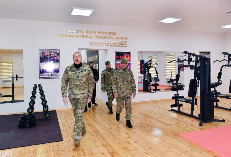Prezident, Müzəffər Ali Baş Komandan İlham Əliyev hərbi şəhərcikdə əsgər yataqxanası, əsgər yeməkxanası və idman zalı ilə tanış oldu.