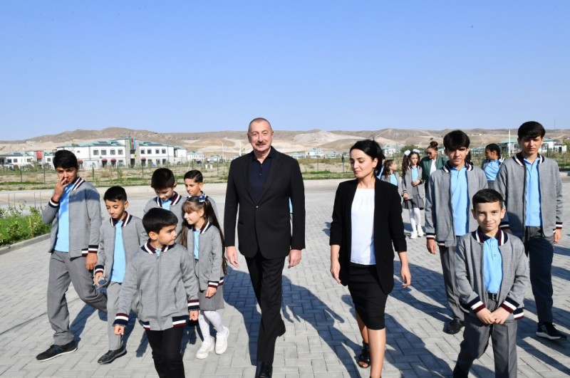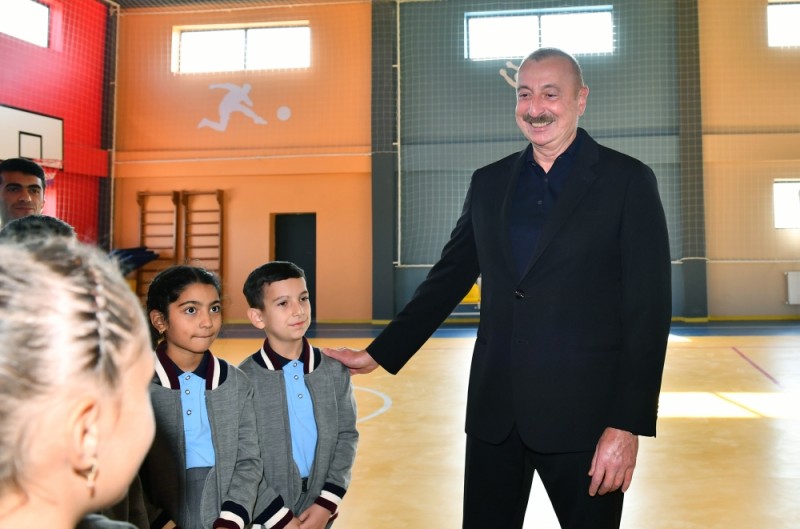 Prezident İlham Əliyev: Gedək, göstərin məktəbinizi, baxaq uşaqlar burada necə oxuyurlar? Sinif otaqlarına baxaq. Sən neçənci sinifdə oxuyursan?