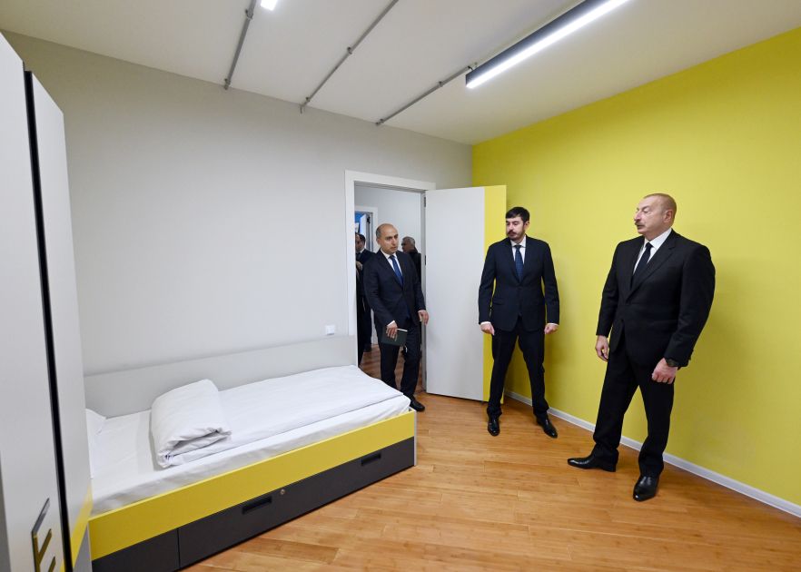 Prezident İlham Əliyev tələbə yataqxanasında yaradılan şəraitlə tanış oldu. Tələbələrin yaşaması üçün nəzərdə tutulan yataqxana mənzil tipli 5 binadan ibarətdir. Binaların hamısı müasir standartlar səviyyəsində əsaslı təmir olunub. Bütün mənzillər müvafiq avadanlıqlarla təchiz edilib, yaşayış şərtləri müasir kampus konseptinə uyğunlaşdırılıb. Yataqxanada istirahət guşələri, yeməkxana və idman sahəsi də fəaliyyət göstərəcək. Ümumilikdə, 1154 tələbənin yataqxanada ödənişsiz əsaslarla məskunlaşması təmin edilib.