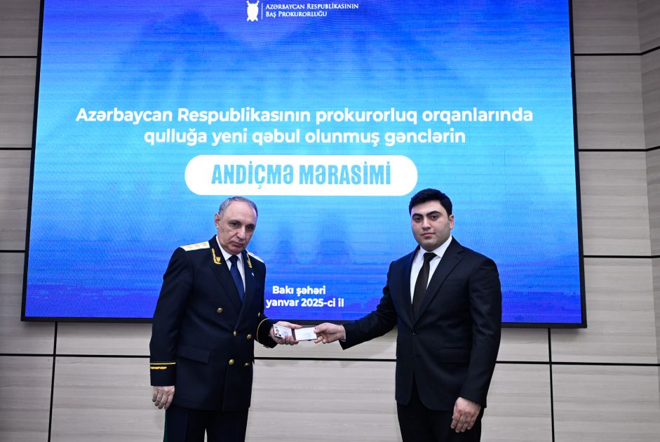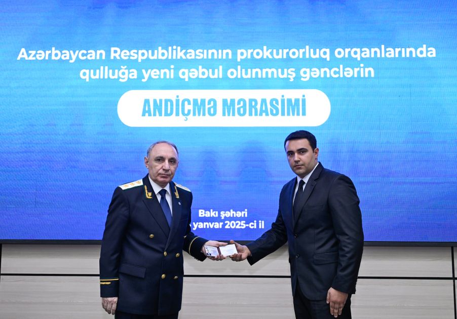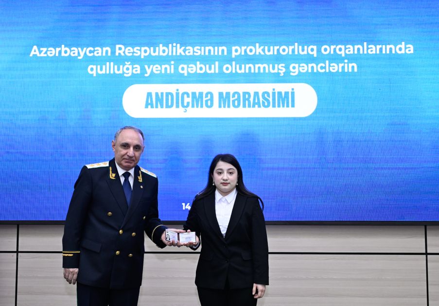 Daha sonra prokurorluqda qulluğa yeni qəbul olunmuş gənclərin vəzifələrə təyin edilməsi barədə Baş Prokurorluq üzrə müvafiq əmr elan edilib, işə qəbul olunanlar təntənəli surətdə and içib və onlara xidməti vəsiqələr Baş prokuror Kamran Əliyev tərəfindən təqdim olunub.