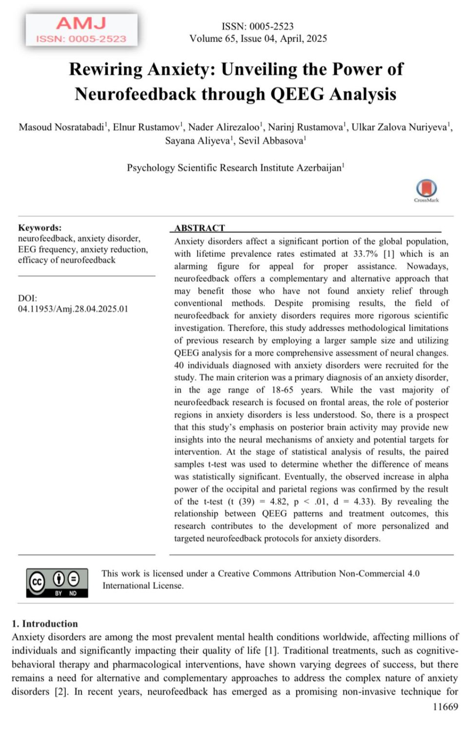 “Təşvişi yenidən proqramlaşdırmaq: QEEG analizi ilə neyrofeedback cihazının gücünü kəşf etmək” adlı tədqiqat işi institutun sədri, fəlsəfə üzrə fəlsəfə doktoru Elnur Rüstəmov, klinik psixoloq Narınc Rüstəmova, psixoloqlar Səyanə Əliyeva, Ülkər Zalova Nuriyeva, Sevil Abbasova və İran mütəxəssisləri Masoud Nosratabadi və Nader Alirezaloo tərəfindən birgə hazırlanıb.