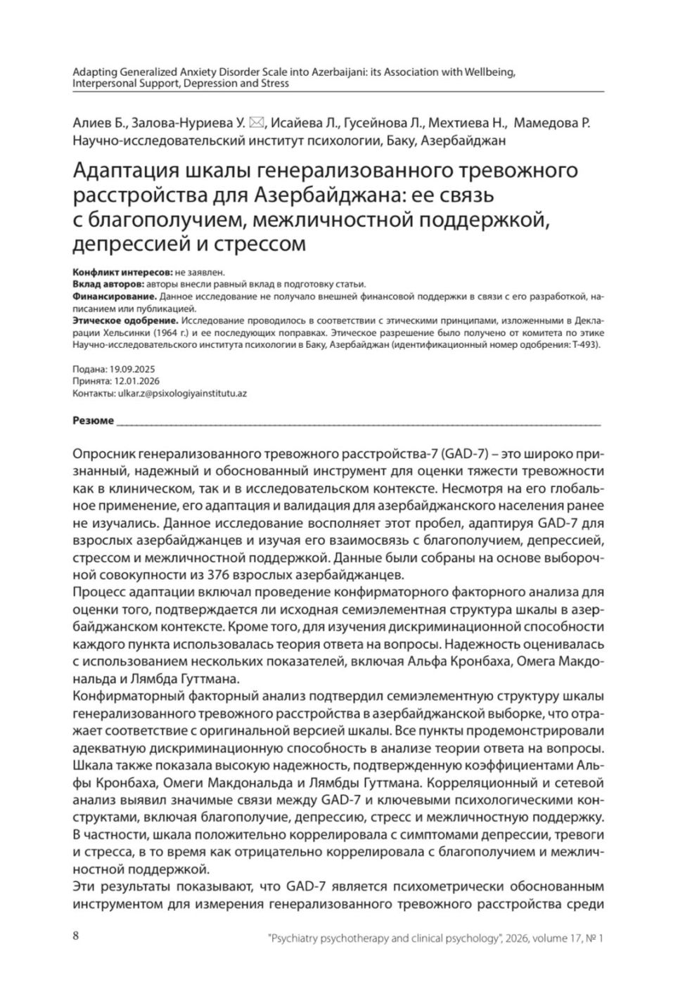 Yaşı 18-dən yuxarı olan 376 nəfərin (323 qadın, 53 kişi) iştirakı ilə aparılan və məlumatların onlayn sorğu vasitəsilə toplandığı araşdırma nəticəsində GAD-7 şkalasının Azərbaycan dilinə adaptasiyası uğurla həyata keçirilib, alətin psixometrik göstəricilərinin — etibarlılıq və validliyinin yüksək olduğu təsdiqlənib.