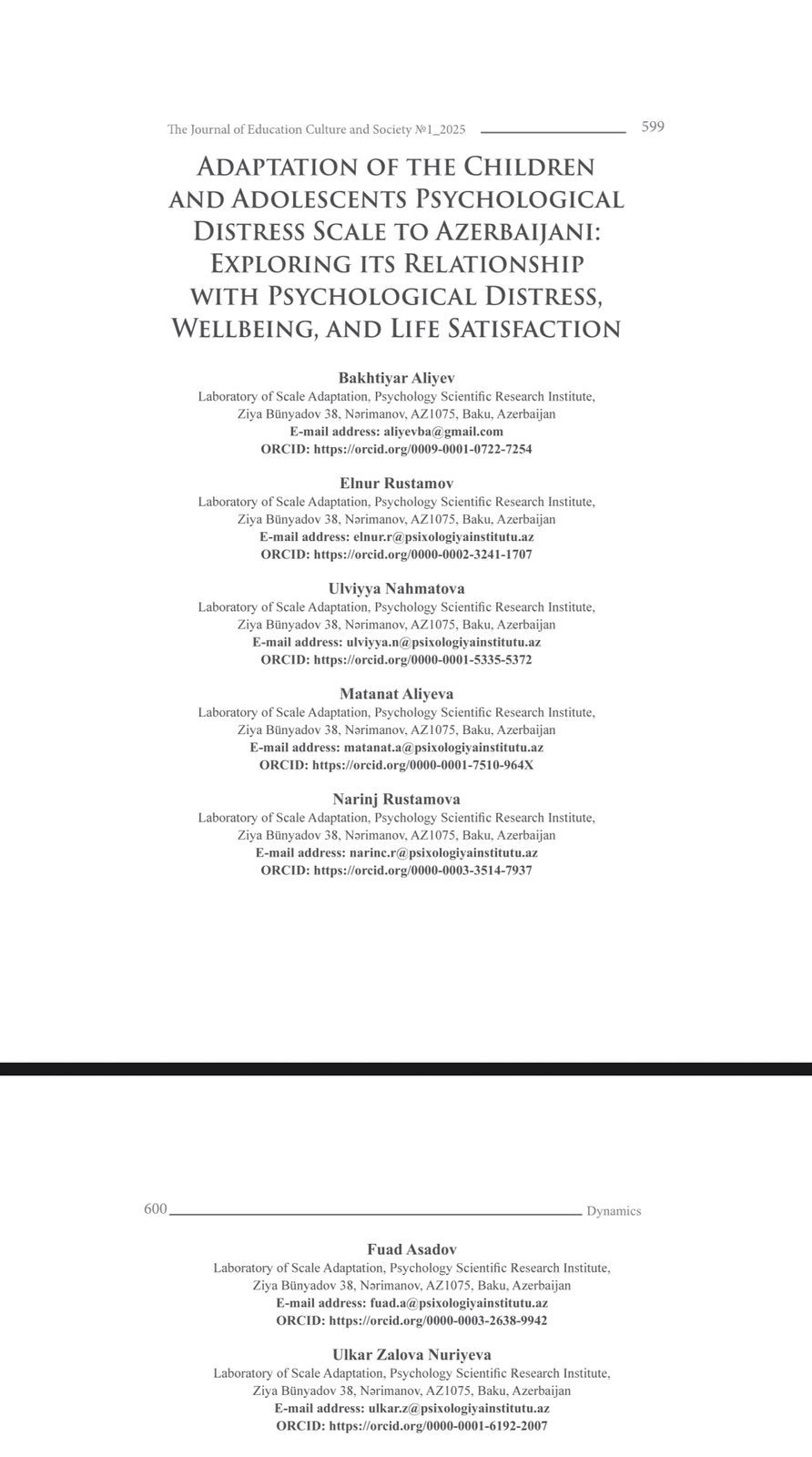 Psixologiya Elmi-Tədqiqat İnstitutu tərəfindən aparılan tədqiqatın nəticələri Q1 kateqoriyasında yer alan, “Web of Science”, “Scopus” və digər beynəlxalq elmi bazalarda indekslənən “The Journal of Education, Culture and Society” jurnalının 2025-ci il, 1-ci nömrəsində dərc olunub.