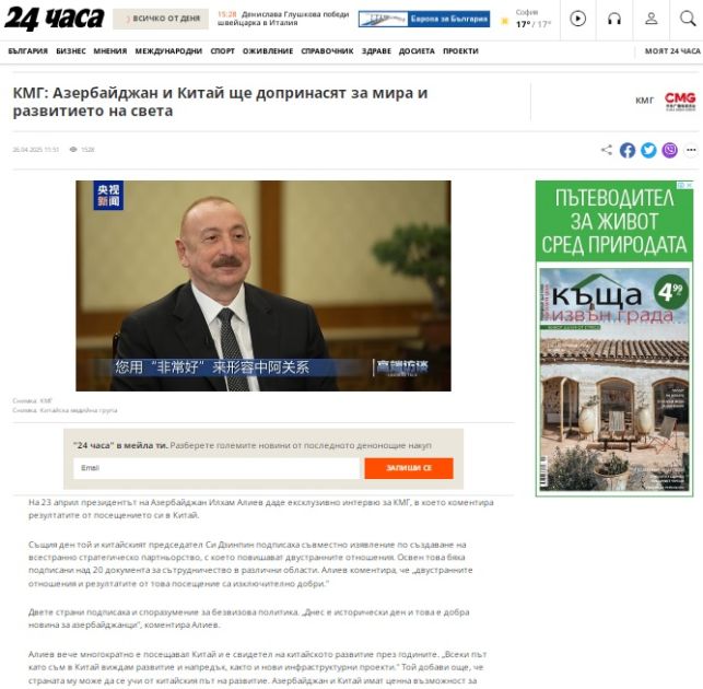 AZƏRTAC xəbər verir ki, Rumıniyanın “Curierul National” qəzetində və Bolqarıstanın “24 chasa” xəbər portalında yayımlanan xəbələrdə Azərbaycan-Çin münasibətlərinin strateji tərəfdaşlıq səviyyəsinə yüksəldiyi vurğulanıb. Qeyd olunub ki, müsahibədə Prezident İlham Əliyev Azərbaycan ilə Çin arasında münasibətlərin inkişafını yüksək qiymətləndirib və səfərin nəticələrindən məmnunluğunu ifadə edib.