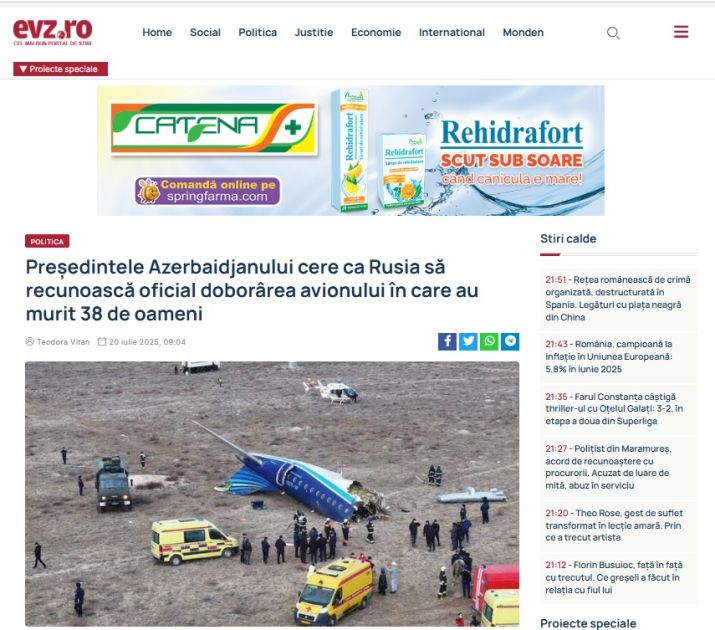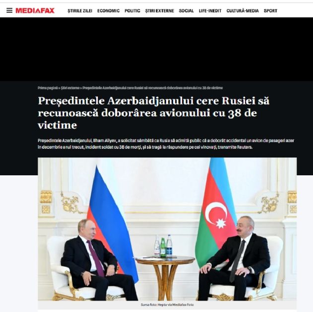 Rumıniyanın “Evenimentul Zilei”, “Mediafax” media orqanları, o cümlədən AGEPRES milli xəbər agentliyi, həmçinin, Bolqarıstanın BTA xəbər agentliyi, “24 chasa” və digər nəşrləri bildirirlər ki, dövlət başçısı Rusiyanın Azərbaycanın sərnişin təyyarəsini vurduğunu rəsmi şəkildə qəbul etməsini vacib hesab edir.