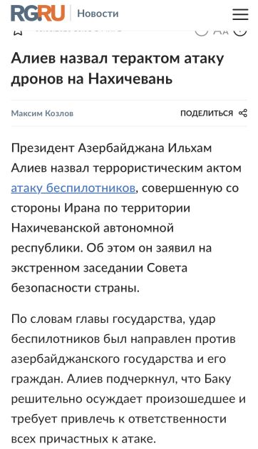 AZƏRTAC xəbər verir ki, Rusiya mətbuatı Azərbaycan Prezidenti İlham Əliyevin Naxçıvana dron hücumunu terror aktı adlandırdığını və günahkarların məsuliyyətə cəlb edilməli olduğunu bildirdiyini yazır. Qeyd olunur ki, Təhlükəsizlik Şurasının iclasında dövlət başçısı rəsmi üzr istəməsini tələb edib və orduya cavab tədbirləri hazırlamağı tapşırıb.