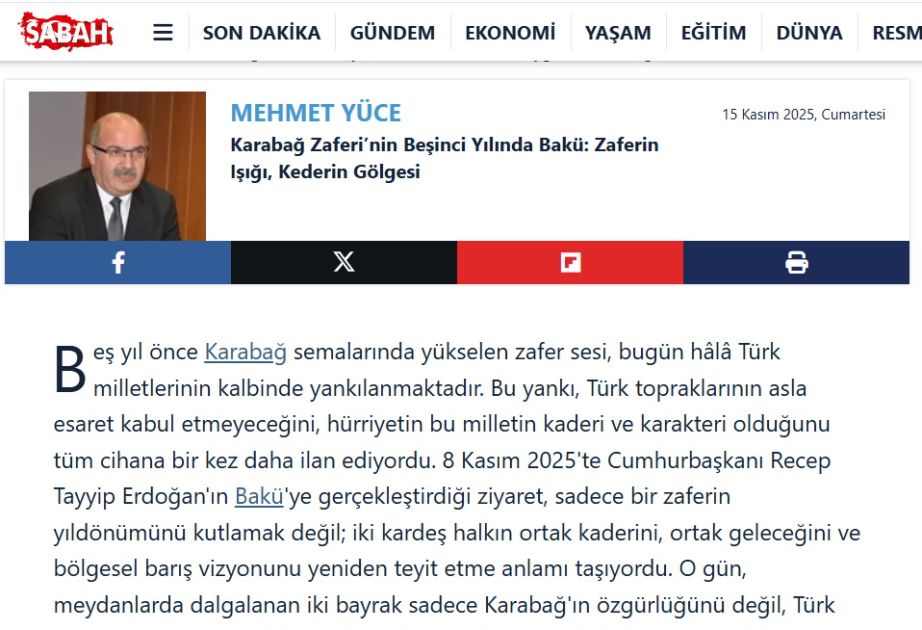 AZƏRTAC xəbər verir ki, bu barədə Türkiyənin “Sabah” qəzetinin “Bakı Qarabağda Qələbənin beşinci ildönümündə: Qələbənin nuru, taleyin kölgəsi” sərlövhəli şənbə yazısında qeyd olunur.