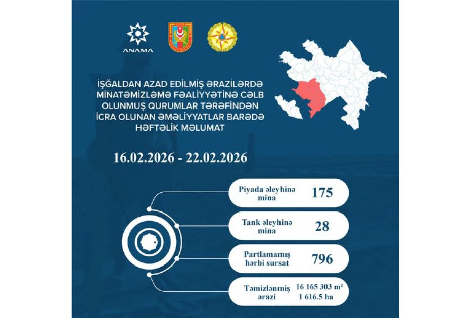 Ötən həftə 203 mina və 796 partlamamış hərbi sursat zərərsizləşdirilib