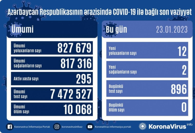 Son sutkada yeni yoluxma hallarının müəyyənləşdirilməsi ilə əlaqədar 896, bu günə qədər isə ümumilikdə 7 milyon 472 min 527 test icra olunub.