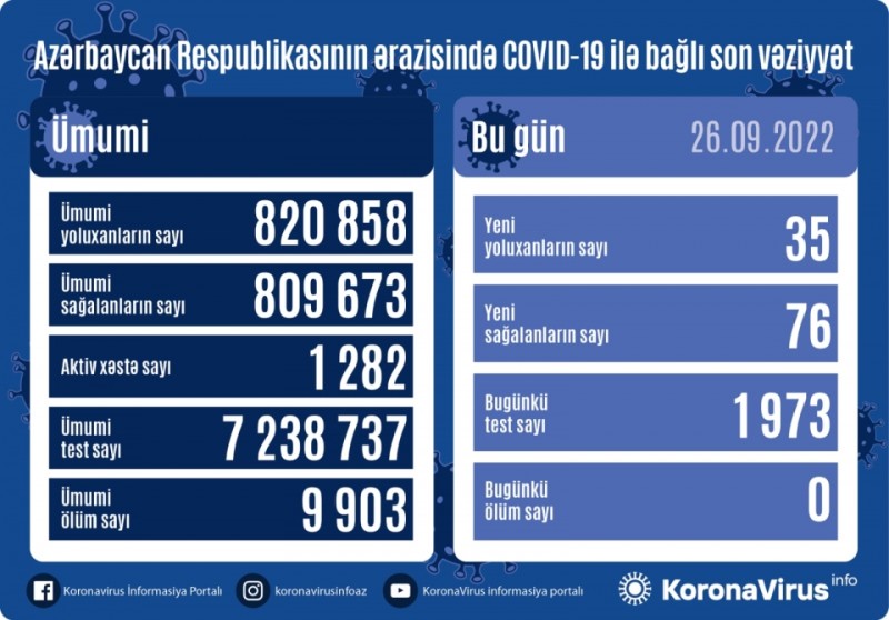Son sutkada Azərbaycanda yeni növ koronavirus (COVID-19) infeksiyasına 35 yoluxma faktı qeydə alınıb, 76 nəfər müalicə olunaraq sağalıb.