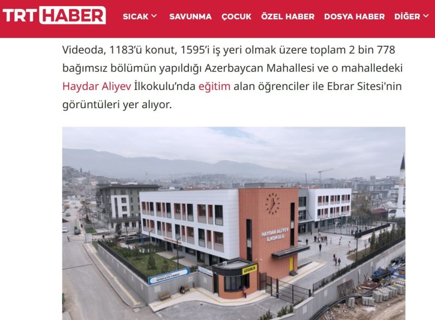 Türkiyənin “TRT Haber” telekanalı ölkəmizin dəstəyi ilə tikintisinin tamamlandığı Kahramanmaraşın “Azərbaycan” məhəlləsi barədə reportaj hazırlayıb.