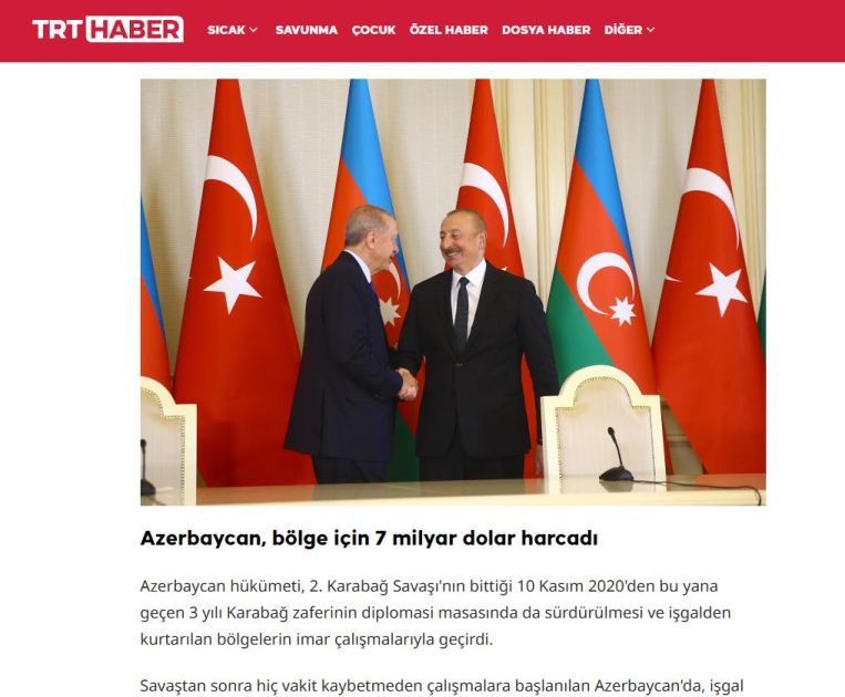 “Bu gün Azərbaycanın işğaldan azad edilmiş torpaqlarında çoxsaylı infrastruktur layihələri reallaşdırılır, “ağıllı şəhərlər”in qurulması konsepsiyası həyata keçirilir, sənaye və kənd təsərrüfatı sahələri dirçəldilir. Son 4 ildə bu məqsədlər üçün təxminən 7 milyard dollar ayrılıb”, - deyə “TRT Haber” bildirir.