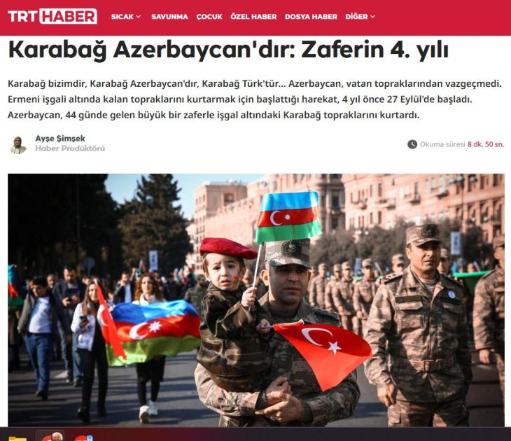 Türkiyə mediası Azərbaycanın 44 günlük Vətən müharibəsində Zəfərinin dördüncü ildönümünü geniş işıqlandırır.
