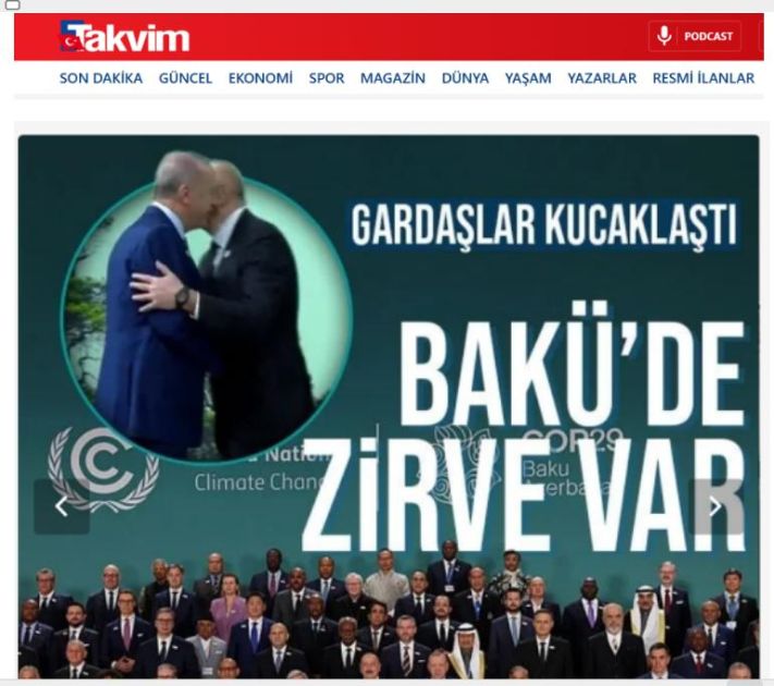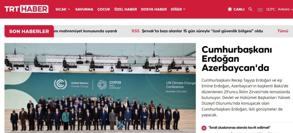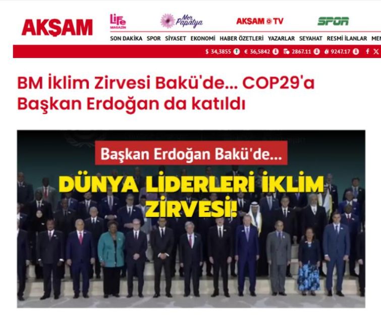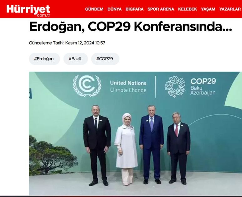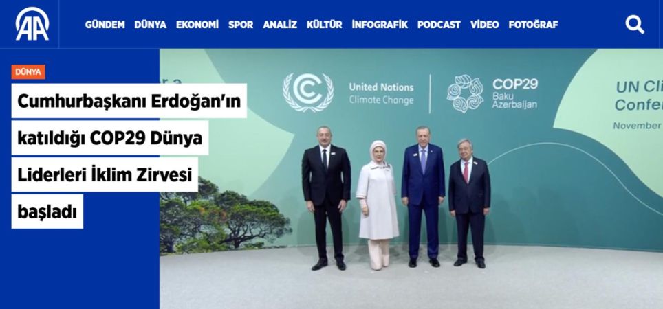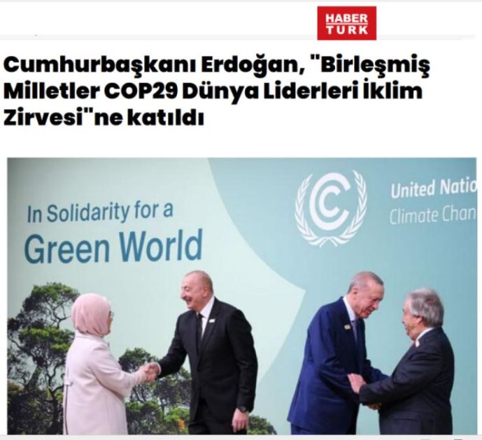Azərbaycanda keçirilən BMT-nin İqlim Dəyişikliyi üzrə Çərçivə Konvensiyasının Tərəflər Konfransının 29-cu sessiyasının (COP29) Lliderlər Sammitinin açılış mərasimi və Prezident Rəcəb Tayyib Ərdoğanın qlobal müzakirələrdə iştirakı Türkiyə mediasında mərkəzi mövzulardan biri olaraq qalır. Türkiyədəki telekanalların, qəzetlərin və xəbər qaynaqlarının gündəmi məhz bu məsələlərə həsr olunub.