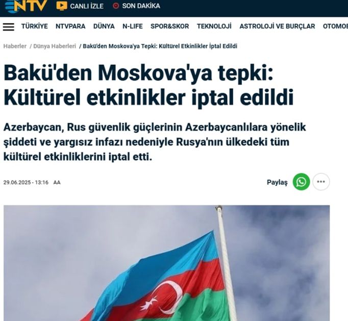 AZƏRTAC xəbər verir ki, milyonlarla tamaşaçı və oxucuya Rusiya hüquq-mühafizə orqanlarının qanunsuz hərəkətlərinə Bakının verdiyi reaksiyadan, o cümlədən, Rusiya dövlət və özəl qurumlarının xətti ilə keçirilməsi planlaşdırılan bütün mədəni tədbirlərin ləğvindən bəhs edilib.