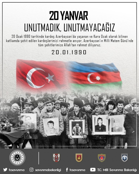 Türkiyənin Milli Müdafiə Nazirliyi internet səhifəsində “20 Yanvar - Unutmadıq, unutmayacağıq!” şüarı ilə paylaşım edib.