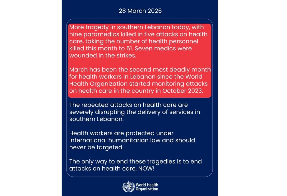 Cənubi Livanda səhiyyə müəssisələrinə edilən beş hücum nəticəsində doqquz tibb işçisi həlak olub, daha yeddi nəfər isə yaralanıb. Bununla da mart ayı ərzində həyatını itirən səhiyyə işçilərinin sayı 51-ə çatıb.