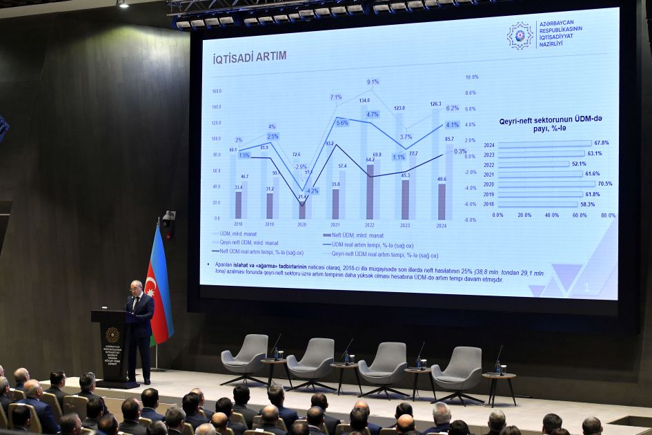 Forumda 2018-2024-cü illərdə ölkəmizin makroiqtisadi artımı, eləcə də qeyri-neft sektorunun böyüməsi, vergi daxilolmalarının qeyri-neft ÜDM-də xüsusi çəkisinin yüksəlməsi, əmək müqavilələrinin sayının artması və digər göstəricilər barədə təqdimat nümayiş etdirilib.