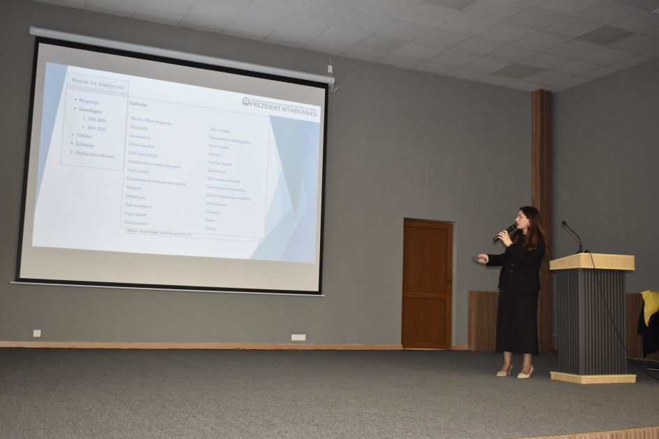 Sonra Prezident Kitabxanasının dövlət idarəçiliyi və ölkəşünaslığa dair informasiya resursları bölməsinin müdiri Kəmalə Qasımovanın “Azərbaycanın dövlətçilik modeli: Konstitusiya, liderlər və milli rəmzlərin vəhdəti” mövzusunda çıxışı dinlənilib.