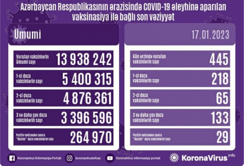 Yanvarın 17-də Azərbaycanda yeni növ koronavirus (COVID-19) infeksiyası əleyhinə 445 doza vaksin vurulub.