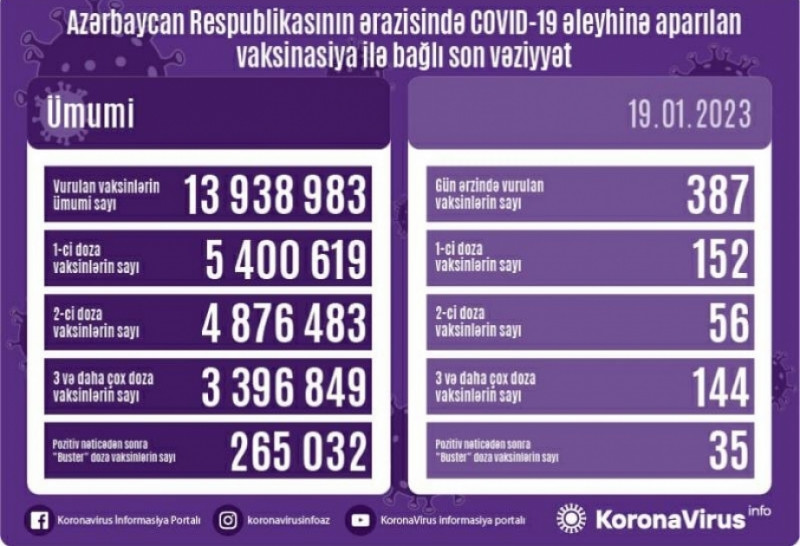 Yanvarın 19-da Azərbaycanda yeni növ koronavirus (COVID-19) infeksiyası əleyhinə 387 doza vaksin vurulub.