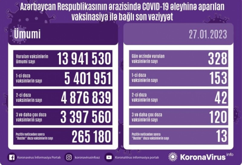 Yanvarın 27-də Azərbaycanda yeni növ koronavirus (COVID-19) infeksiyası əleyhinə 328 doza vaksin vurulub.