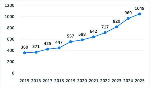 Şəkil 2. Azərbaycan Respublikasında orta aylıq pensiyanın dəyəri, ABŞ dolları alıcılıq qabiliyyəti pariteti ilə. Mənbə: Azərbaycan Respublikasının Dövlət Statistika Komitəsi, 2025; Dünya Bankı, 2025.