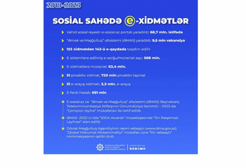Dövlət sosial xidmətləri sahəsində e-texnologiyaların tətbiqi aparılan sosial islahatların əsas istiqamətlərindən biridir. 2018-2023-cü illərdə Əmək və Əhalinin Sosial Müdafiəsi Nazirliyinin fəaliyyət sahələri üzrə geniş rəqəmsallaşdırma proqramı icra olunub və hazırda nazirlik üzrə 153 xidmətdən 143-ü e-qaydada təqdim edilir.