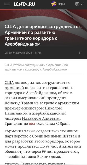 “Lenta.ru” ABŞ Prezidentinə istinadla xəbər verir ki, Ermənistan bu dəhlizin inkişafı üçün Vaşinqton ilə 99 il müddətinə və uzadılma imkanı ilə eksklüziv tərəfdaşlıq yaradır.