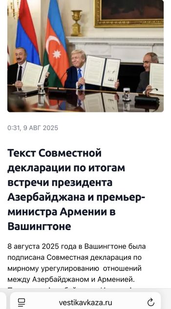 “Vestnik Kavkaza” yazır ki, Azərbaycan və Ermənistan liderləri münasibətləri sülh yolu ilə nizamlamaq niyyətlərini sənədləşdiriblər. Birgə Bəyannamədə hərbi toqquşmalardan imtina, nəqliyyat kommunikasiyalarının açılması, diplomatik münasibətlərin qurulması və ərazi bütövlüyünə qarşılıqlı hörmət prinsipləri yer alıb.