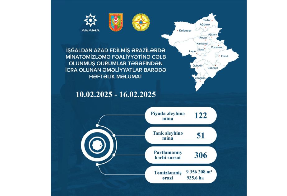 Azərbaycan Respublikasının Minatəmizləmə Agentliyi (ANAMA) işğaldan azad edilmiş ərazilərdə minatəmizləmə fəaliyyətinə cəlb olunmuş qurumlar tərəfindən fevralın 10-dan 16-dək icra edilən minatəmizləmə əməliyyatlarına dair məlumatı açıqlayıb.