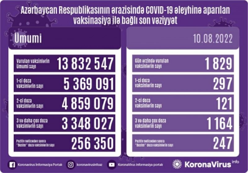 Avqustun 10-da Azərbaycanda yeni növ koronavirus (COVID-19) infeksiyası əleyhinə 1829 doza vaksin vurulub.