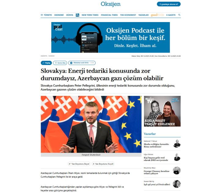 “Oksigen” qəzetinin məqaləsində bildirilib ki, Prezident İlham Əliyevin Prezident Peter Pelleqrini ilə görüşündə enerji təhlükəsizliyində Azərbaycanın strateji rolu və müdafiə sənayesi sahəsində birgə layihələrin perspektivləri müzakirə olunub. Slovakiya Lideri ölkəsinin enerji mənbələrinin şaxələndirilməsində Azərbaycanın aparıcı rolunu vurğulayıb və birgə istehsal olunacaq müdafiə məhsullarının üçüncü ölkələrə satış imkanlarına diqqət çəkib.
